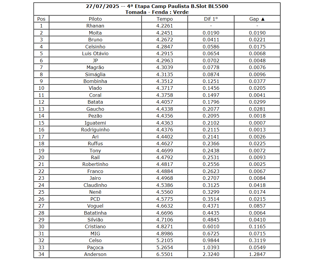 A B.SLOTCAR e a GT Racing convidam os pilotos e amigos para a 4ª Etapa do Campeonato Paulista 2025, categoria brushless 5500kv Sprint, que será realizada no dia 27 de julho, a partir das 8h com corrida às 13h.