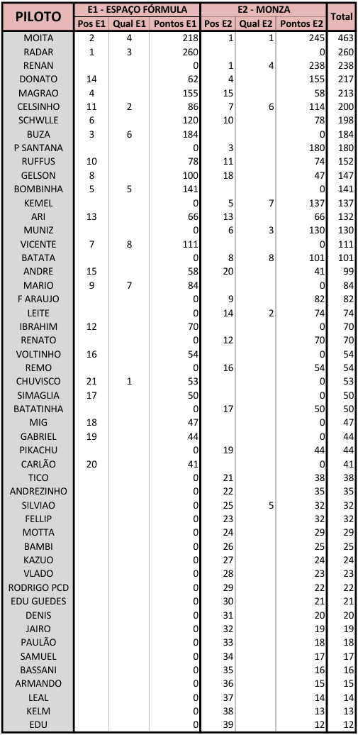Em caso de empate na pontuação, ao final da temporada, o desempate é calculado pelo no número de vitórias, seguido pelo número de segundos lugares, e assim sucessivamente, comparando as posições de chegada.